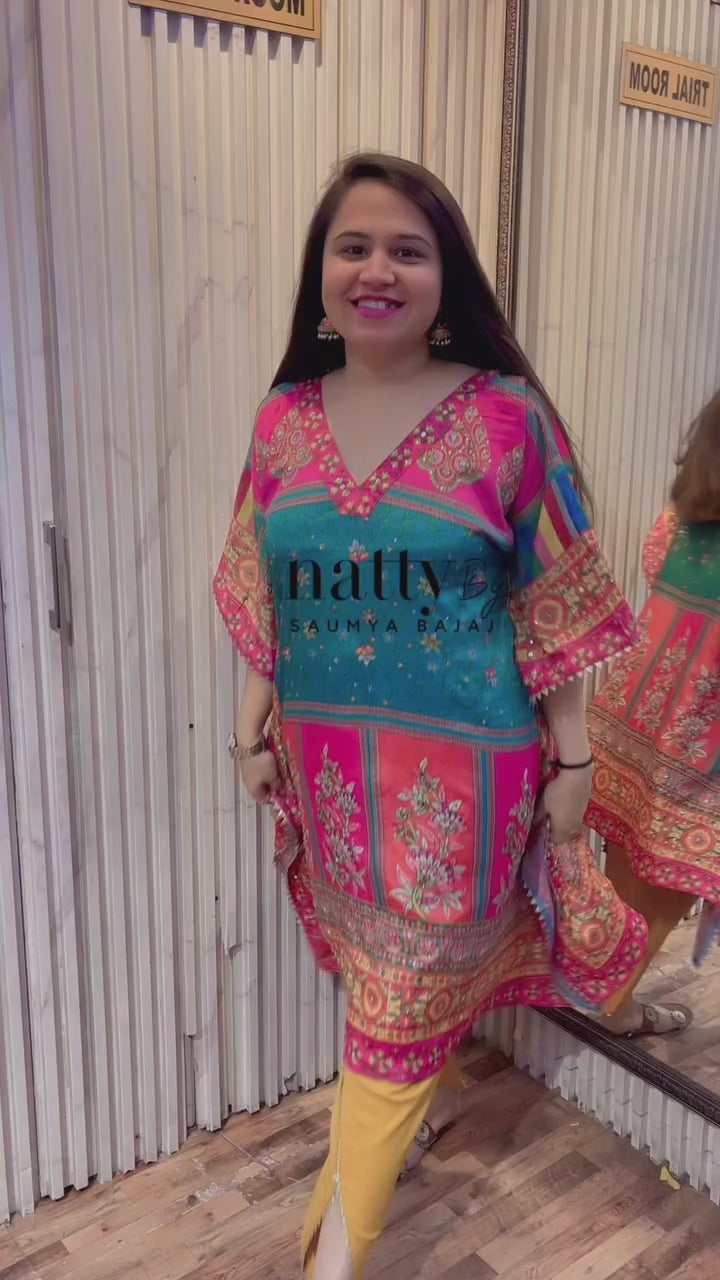 This multicolor printed kaftan kurta paired with yellow pants is a celebration of color and culture. Its breezy silhouette ensures comfort, while the rich print and vibrant bottoms create a standout festive look. Ideal for adding a bold touch to your daywear or event wardrobe.