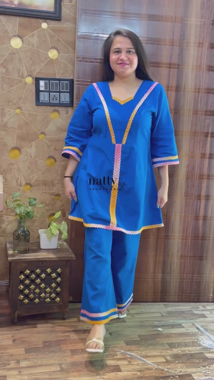 This blue cotton co-ord set combines comfort and style with its playful lace detailing. Perfect for casual outings or small celebrations, it brings color and cheer to your everyday ethnic wardrobe.