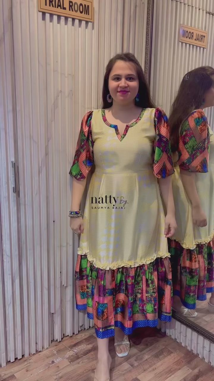 A celebration of color and creativity, this maxi dress blends bright yellow geometric prints with vibrant patchwork details. The puff sleeves, tiered hemline, and flattering fit-and-flare silhouette make it a joyful choice for brunches, vacations, or casual get-togethers. Comfortable yet eye-catching, it’s your go-to statement dress for sunny days.
